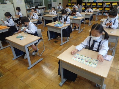 青色カルタの11番と12番を読む練習をしてから、1番から通して読む練習をしました。読むときの抑揚がみんなできれいにそろい、読み合わせをする良さが感じれるほど上手に読めるようになりました。