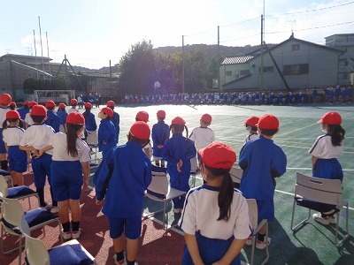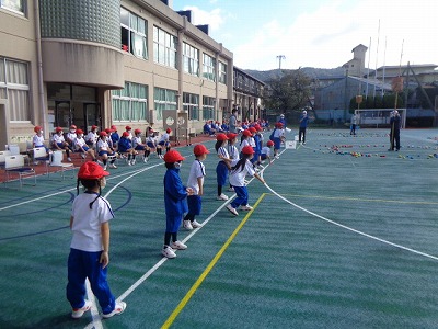 1時間目、運動場に集合して、スポーツフェスティバルの練習をしました。
