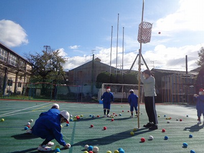 赤組と白組が4カ所のかごに分かれて、一生懸命投げました。