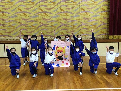 1時間目の学活では、赤組・白組それぞれで完成した応援ポスターとともに「エイエイオー」とメンバーで心合わせをしました。