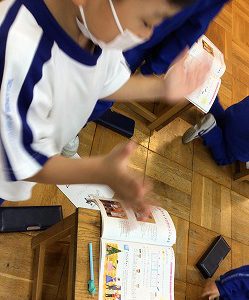 2年生との合同ダンス練習です。赤組・白組で半分に分かれてダンスをして、お互いに見合いっこをしました。