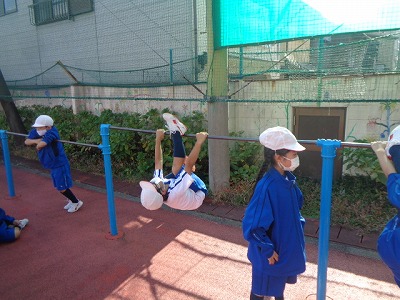 久しぶりの鉄棒練習です。前回りや足抜き回りなどを練習してから、いくつかの技を