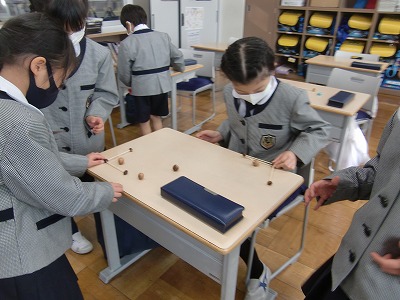 ドングリのやじろべえで遊んでいます。教室にあるいろいろな物を使ってバランスをとっています。