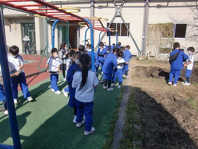 やわらかくて、よく味が染みていました。丸い大根は、1年生が収穫した大根に間違いないよ!と教わった1年生。