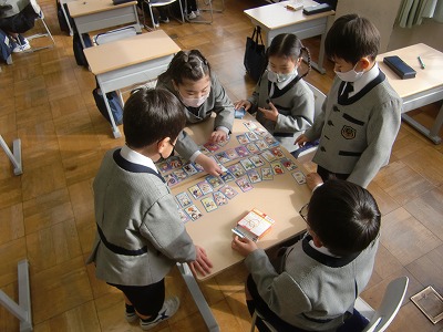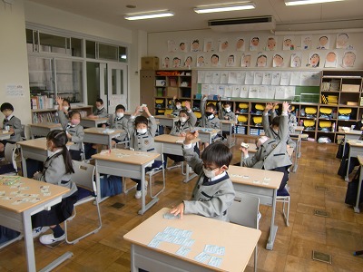 自分の机に20枚の札を並べて、教師が読んだ札を取る学習です。以前から国語や根っこタイムでも経験しているので、もう覚えたよと言わんばかりに、みんな得意げな顔で取り組んでいました。