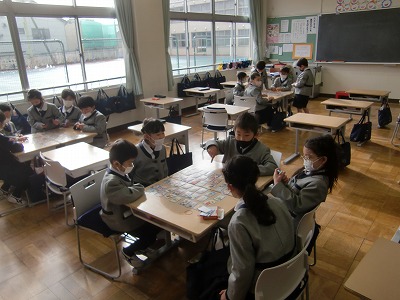 今日も、「お正月のくらしとあそび」の学習で、かるた取り遊びをしました。