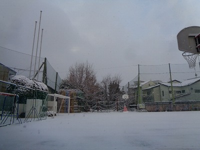 今朝、朝の運動場は、雪で一面真っ白でした。