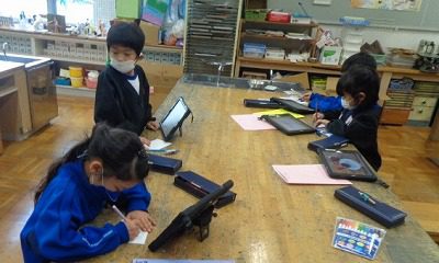 来週の作品展に向けて、自分の作品の題名を札に書いたり、作品の頑張り・工夫ポイントを文章でまとめました。