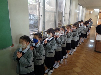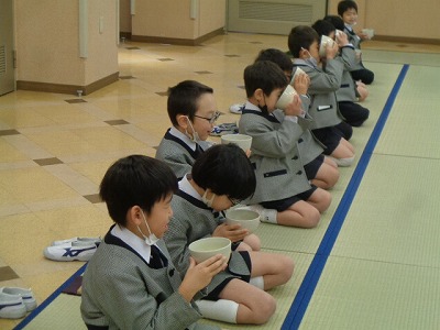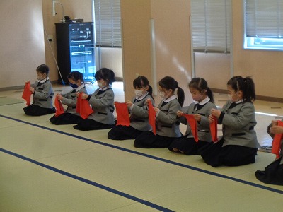 今日は初めての「礼法学習」。学習へ向かう一年生です。