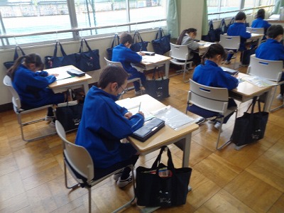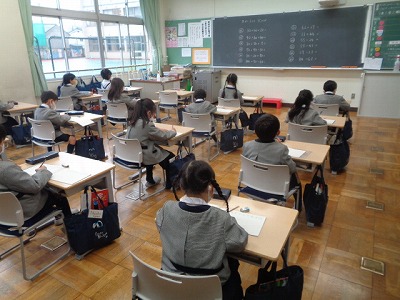 計算は、3つの数の足し算・引き算です。短時間でノートに写し、答えを書きます。計算力をコツコツ積み上げています。