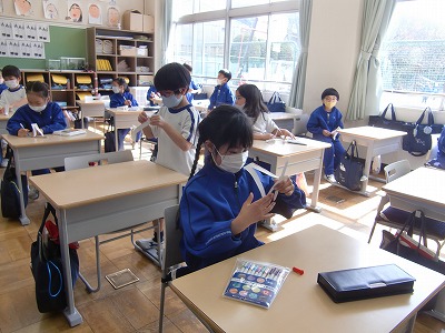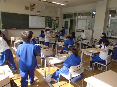 木曜日の朝、準備体操開始に向けて登校後の教室では、いつもよりスピードアップして準備・着替えをする姿が見られます。算数プリントのお直しを済ませると、運動場へ!今日も寒い中にも日差しのあたたかさが感じられるいいお天気です。1年生の朝根っこマラソンも残りわずか・・・今日は各自で目標を決めて、走りました。