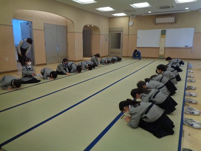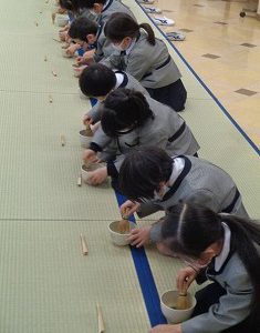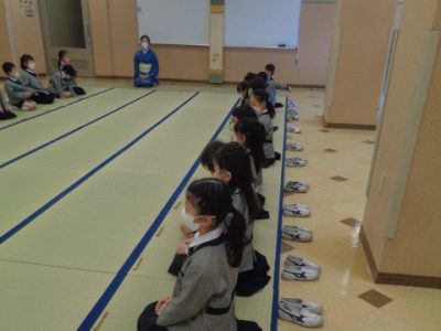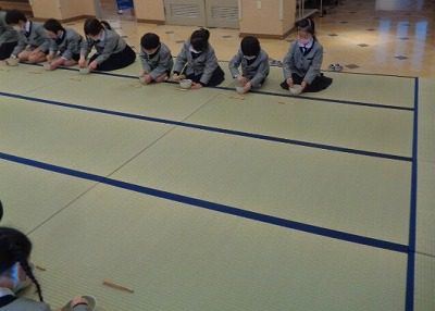 移動の仕方や座る場所をおぼえ、お茶会の流れを確認しながら、3つのグループに分かれて練習しました。