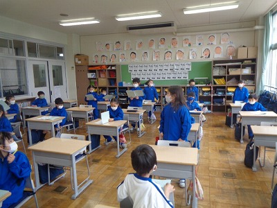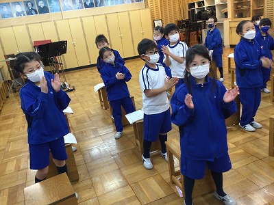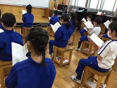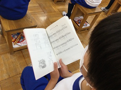 1年生の皆さんは、一生懸命に歌ってくれます。言葉を伸ばして発声するときの注意をよく心得て、1番を歌うことができました。背筋を伸ばし、とっても良い姿勢で歌っている姿は、すっかり2年生のようです。
