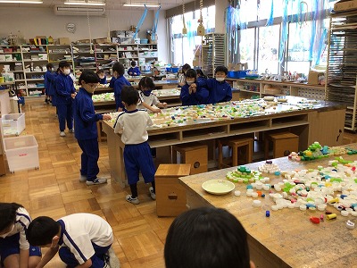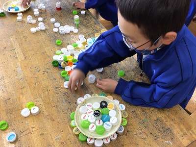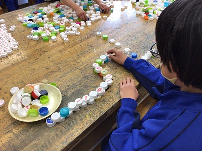 図画工作の時間では、たくさんの「キャップ」を使って何ができるか、何がつくれるかを考えながらの活動です。