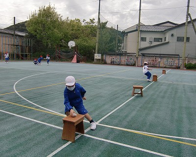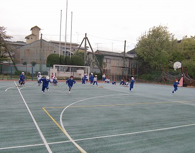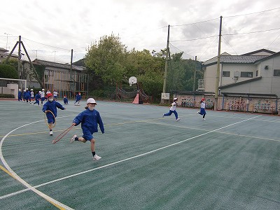 今日はかけっこの2時間目で、輪を使ったかけっこと紅白玉を使った置き換えリレーをしました。