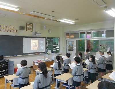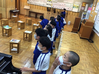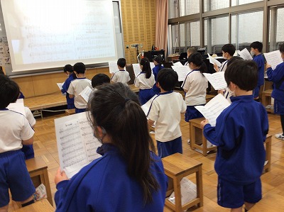 「全校で歌える歌を!」と「♪赤い屋根の家」「♪あの青い空のように」を練習しています。「♪赤い屋根の家」は、2年生で歌うのは初めてなので、昨日から練習を始めています。