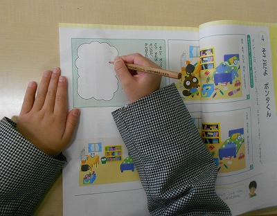 「ともだちをさがそう!」というテーマで、遊園地の絵の中から迷子を探す学習に取り組んでいます。