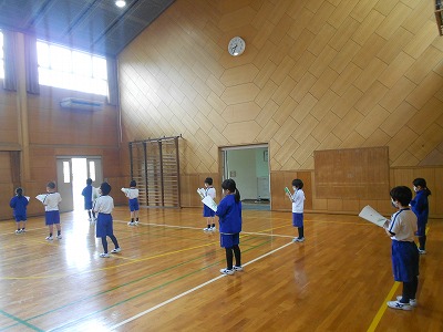 今日は体育館で音読をしました。国語の教科書を持ち、『たんぽぽのちえ』を読みました。