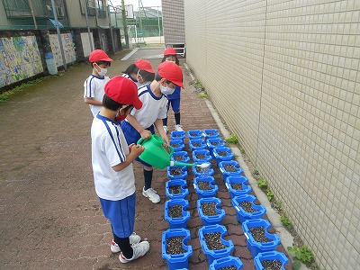 掃除の時間、日直さんはマリーゴールドの水やりをしています。
