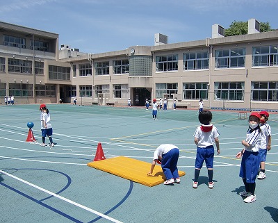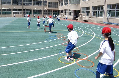 各チームが、リングやマットや長縄などの障がい物をいろいろに見立ててコースを作り、楽しく運動しました。