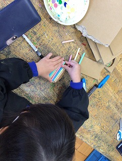 段ボールほかに、ポスカ・ストロー・上質紙・タックシールを使って、みんな様々な機能を考えていました。