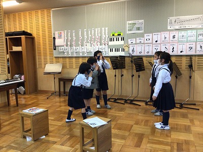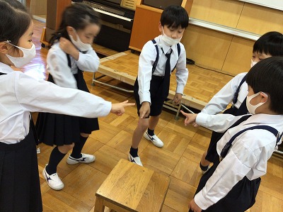 「♪かくれんぼ」の“よびかけ歌”の学習を発展させ、“よびかけっこあそび”と題して、言葉(セリフ)も、グループで考えた歌遊びに取り組みました。