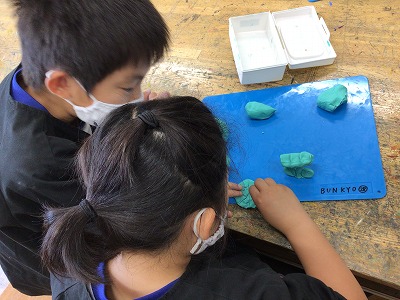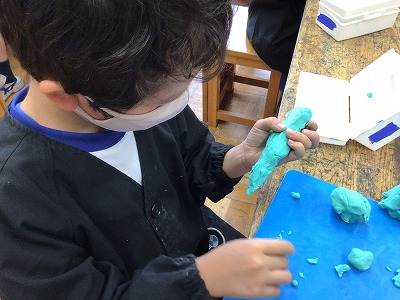油粘土を「ぎゅっ」とにぎった形から「何に見えるか」を考えながらつくっていきました。