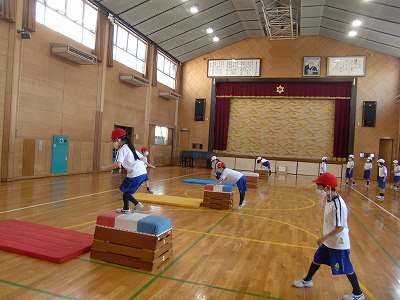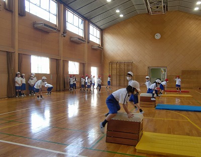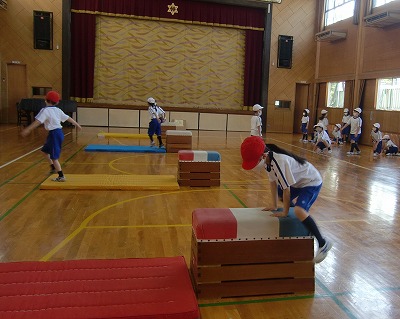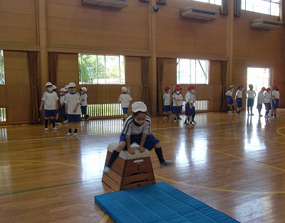 はじめに、跳び箱に上って飛び降りたり、2回に分けて飛び越したりする軽い跳び箱運動を行いました。