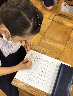 練習プリントの続きを進めています。少し長丸に書くことや棒の付け方など、形に注意しながら書いています。