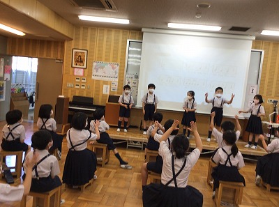 「♪虫歯建設株式会社」(虫歯予防デーに合わせて)や「♪上を向いて歩こう」(全校で歌っています)の歌唱練習をした後は、「リズムまねっこ」を行いました。