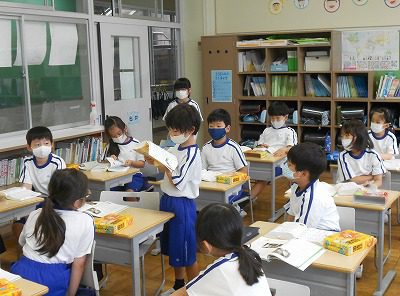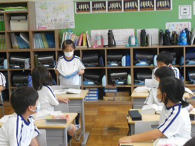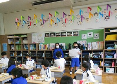 給食の時間です。「いただきます」の挨拶をする前に、「スクールランチ係」さんがみんなに連絡をします。今日のメニューを紹介し、食べる時に心がけることをみんなに伝えています。