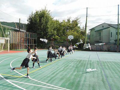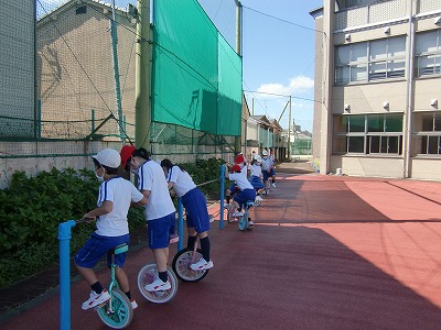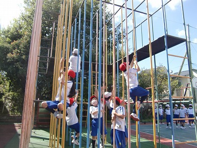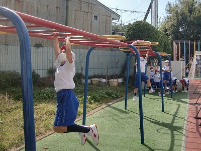 秋晴れの運動場で、今日は、準備体操、登り棒・遊具・うんていチャレンジ、徒競走、一輪車の活動をしました。