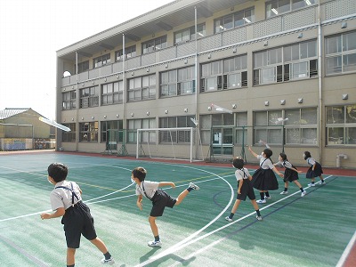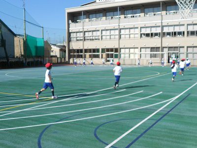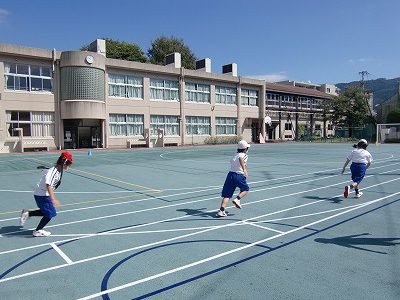 さわやかなお天気の中、小学校グラウンドを2周走っています。