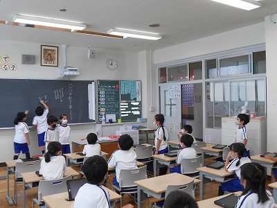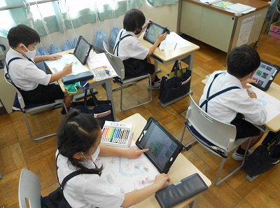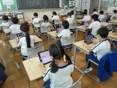 タブレットに入力して、一人一人の考えを共有しています。