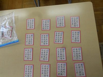 20首の中から16首を選び、ビンゴゲームのような形で16枚の取り札を並べました。