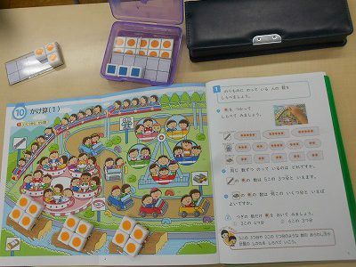 下巻の最初は「かけ算」の学習です。1年生の時に「同じ数ずつ」の学習をしたことを復習しながら学習を進めました。