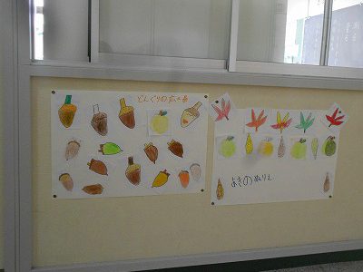 秋をテーマにしたぬり絵を作り、30人みんなのぬり絵が貼られています。