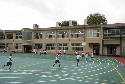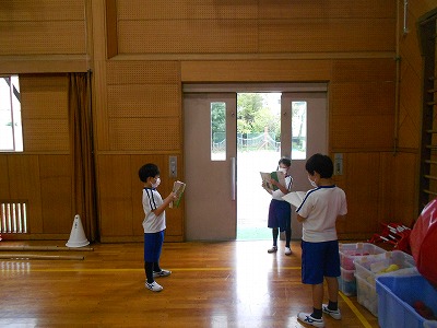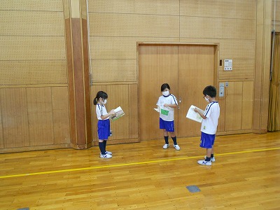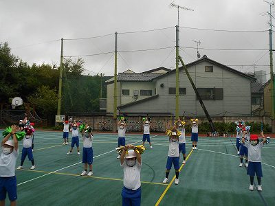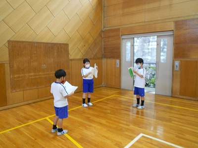 昨日に続き、今日も1・2年合同体育で低学年演技の練習をしました。