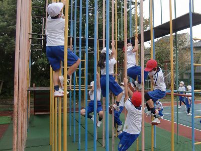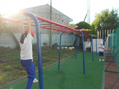今朝も元気に遊具で遊んでいます。