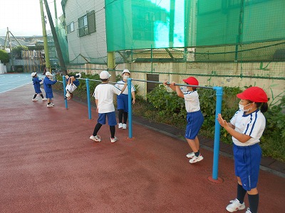 鉄棒では、技を見せ合ったり、今練習している技を伝え合ったり、教え合ったりしながら練習していました。