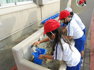 マリーゴールドを育てた植木鉢をスポンジできれいに洗っています。