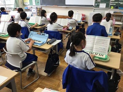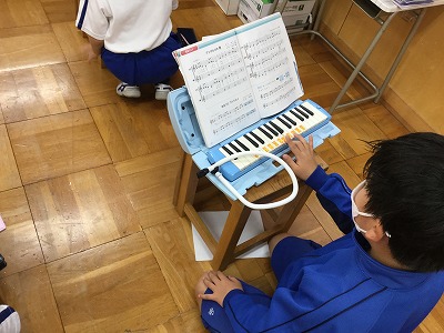 まずは、音楽室で“エア練習”です。「指の引っ越し」を繰り返す曲なので、素早く「ソ」の場所を変えるところが難しいです。
