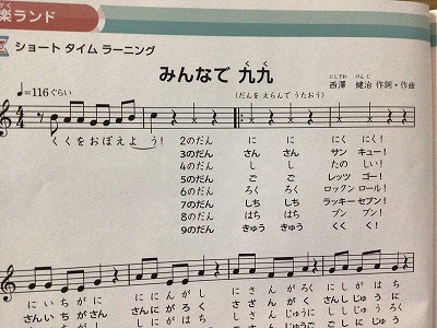 もう一つは「みんなで九九♪」。題名の通り「にいちがに」から「くくはちじゅういち」までが、歌詞です。なかでも…