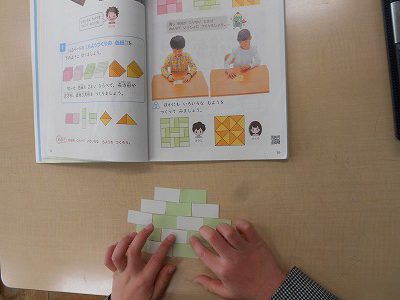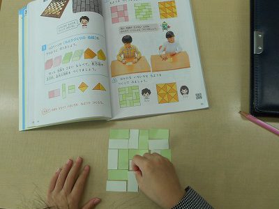 昨日は正方形の色板、今日は長方形の色板を使って、もよう作りをしました。