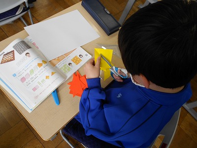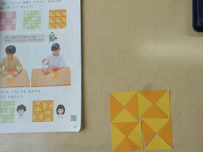 後半は、これまでの「もよう作り」のまとめとして、自分で折り紙を切って、正方形・長方形・直角三角形を作りました。