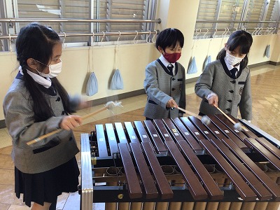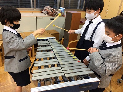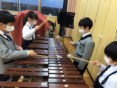 マリンバなら、低い音から高くてかわいい音まで多彩に奏でることができます。いろいろな「レ・ソ・シ」を選んで、2年キッズの音楽作りが広がりました。演奏の合間に「○○時計」と、自分たちの音楽に「題名を付ける」ことを指示しました。