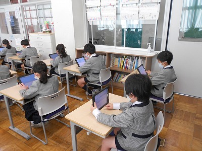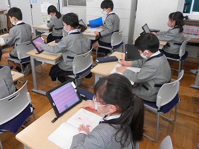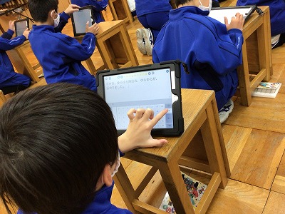 タブレットに自分たちの作った音楽の題名を打ち込み、他のチームの音楽を聞いた感想や、自分たちの取り組みを振り返ります。
