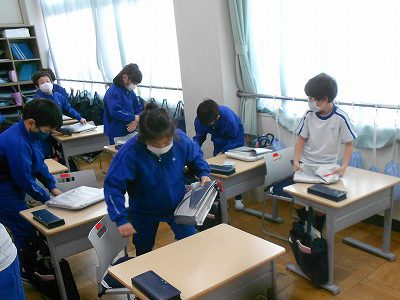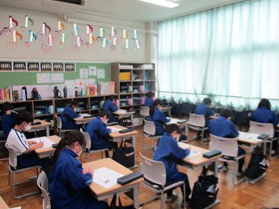 教室やトイレ、廊下、運動場など、それぞれの場所にいる時に地震が起こったら、どうすればよいかを確かめたり、避難する時のポイント「お・は・し・も・て」の内容を復習したりしました。