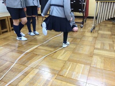 縄を使って“ズンチャッチャッ”のリズムを刻みます。「閉・開・開」のくり返しに、先週練習した3拍子ステップが加わります。