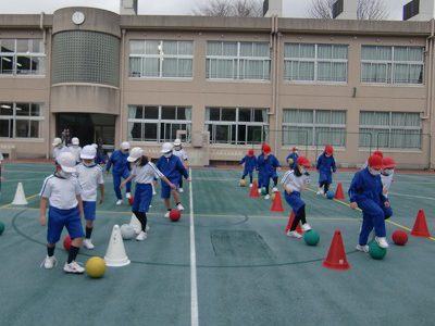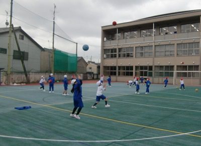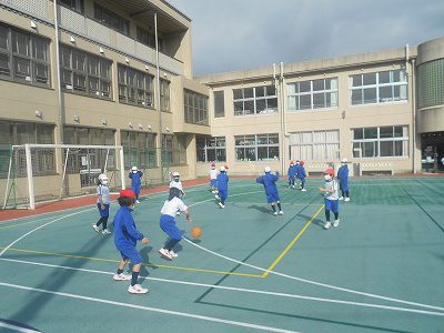 ボールを投げて受け取るまでに、何回手をたたけるかな?「5回はできたよ。」「最高は13回…?」などと楽しんで取り組んでいます。